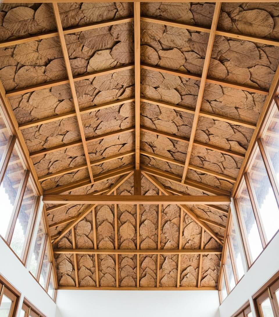 The irregular, layered texture of teak leaves provides organic sound absorption. Integrated as a ceiling finish, the material reduces reverberation time and improves speech intelligibility — especially valuable in cafés, restaurants, and open lounge areas.